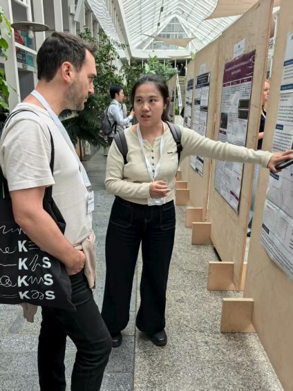 苏然通过海报展示介绍了暴力袭击情境下行人博弈行为的研究成果,该研究应用演化博弈理论分析行人策略,阐明策略演化及奖励机制下的行为变化趋势,为疏散策略研究提供了新视角,引发与会者广泛关注。