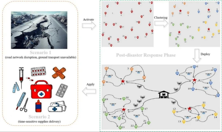 面对无人机应急物流中的灾后环境高度不确定性挑战,创造性的构建了“母-子无人机”协同的药品配送调度模式,并建立可同时优化临时仓库选址、母无人机调度、子无人机路径规划的分布鲁棒优化模型,有效平衡了经济性与抗风险能力,为无人机物流在极端场景下的可靠运行提供了决策支持。