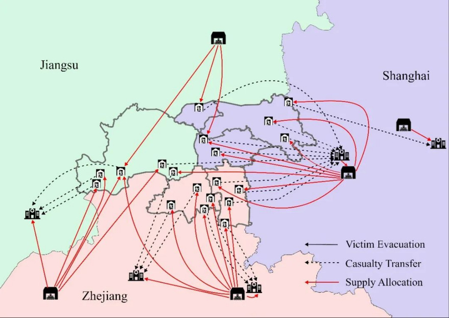 系统规划创新:构建韧性应急网络与可靠物流体系在宏观系统规划层面,赵来军教授团队连续取得突破。针对城市群灾害应急响应中,面对地面道路受损、跨城距离远、医疗资源配送不均等难题,提出了韧性导向的协同应急设施选址-分配模型,创新将直升机跨区域转运机制融入网络设计,构建了“空地协同”救援新模式。以长三角示范区为案例的仿真表明,应急响应时间可缩短1.26小时,网络韧性提升19.51%,跨区域协同救援对提升“黄金救治时间”保障能力有显著价值。
